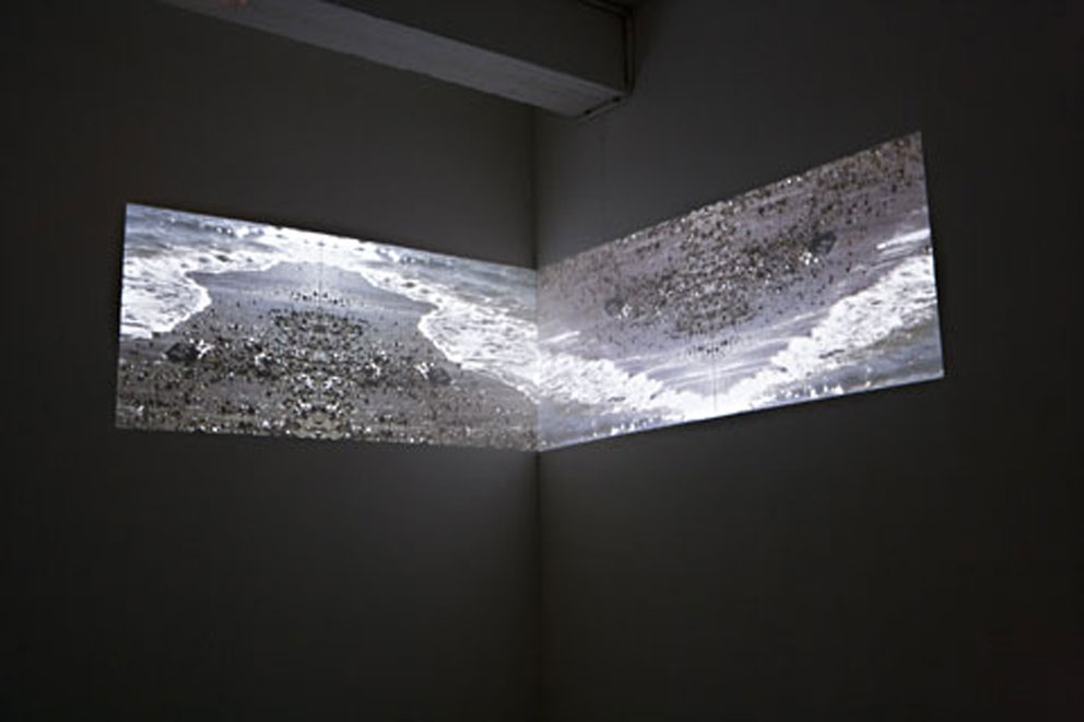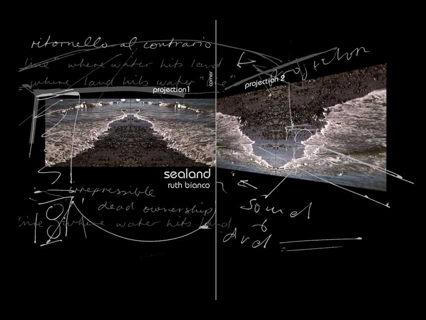 SEALAND, 2-video projection work that explores the line between land and sea, a transient space questioning the notion of ownership. This tidal dialogue evokes a conceptual parallel for nomadic itinerancy - a fluid line of flight escaping fixture, forever migratory. The politicisation of the shoreline reflects upon the very difference between stable land and the changeable substance of the sea. The line where water hits land, a "line" redrawn at every moment, is nature's own semiology; its language for the erasure of its own framework, denoting never a stable ownership.