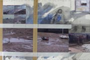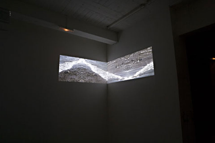 This piece emerges as a metaphor for the geography and politicisation of the two great archaeologies of land and sea. The work embodies a segment of time exploring the itinerant "line" between land and sea. It consists of two split-screen videos aligned in a corner space creating undulating enclosures of land.. a "contrary return" caught in eternal loop. This sea-land dialogue echoes the geopolitics surrounding land, sea, migration and movement, out of which our histories evolve. The ambivalent interplay of line and flight (strata and erasure) resonates in the unstable shoreline - a refrain to what separates and yet joins one land with another, and ultimately one human being with another.