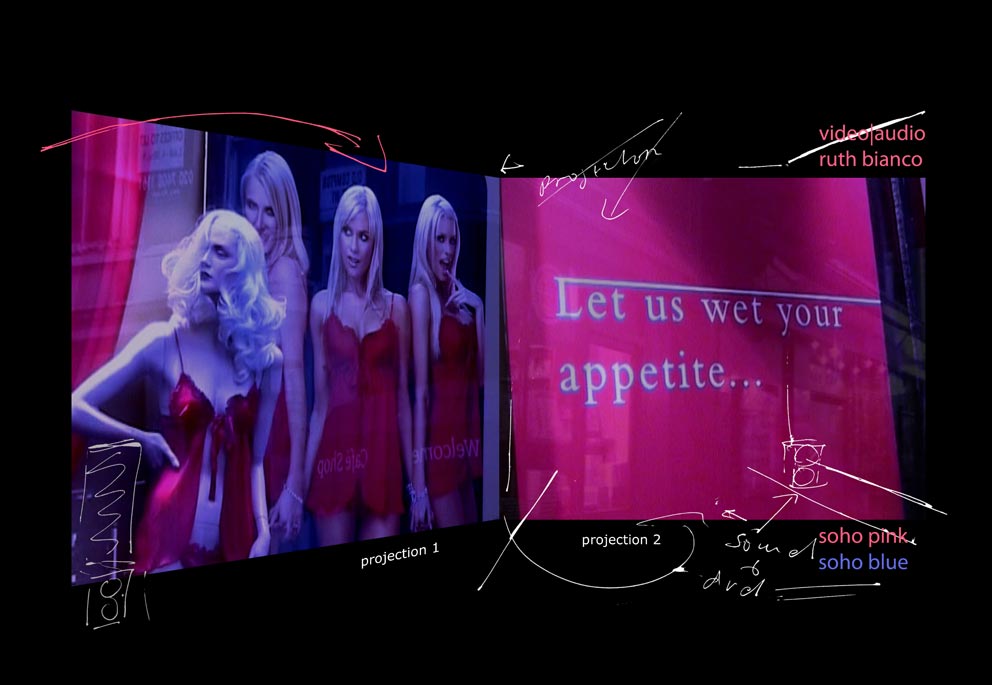 Concerned with a territory marked out for the consumption of sex, the SOHO videos record the masked realities of lure and seduction that become the object of the way we trade "gaze". The sleaze surrounding the consumerism of the human market is aligned with the surreptitious gaze of the filmmaking process in soho pink - a film made with a hidden camera inside the porn shops of Soho in London. soho blue traces the outside lure and signs of this city's red light streets.